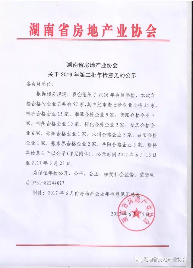 湖南省房地產(chǎn)業(yè)協(xié)會(huì)關(guān)于2016年第二批年檢意見(jiàn)的公示