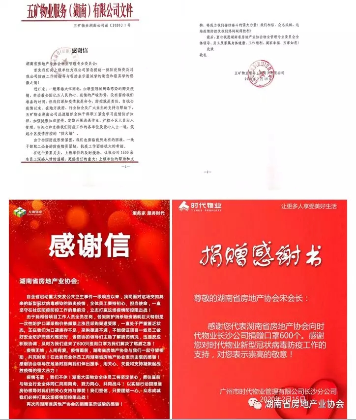 當協會致力于使我省房地產行業防疫工作得到更多關注和支持時,協會也收到來自市州協會和會員單位200多份沉甸甸的感謝信。此外,省住建廳、長沙市住建局、中物協等單位都給予了高度認可。中國物業管理協會先后發表《湖南省房協:抗擊疫情——湖南省房地產業協會在行動》、《50萬人的戰“疫”湖南省物業服務疫情防控工作紀實》,肯定了湖南物業人戰勝疫情的堅強決心。