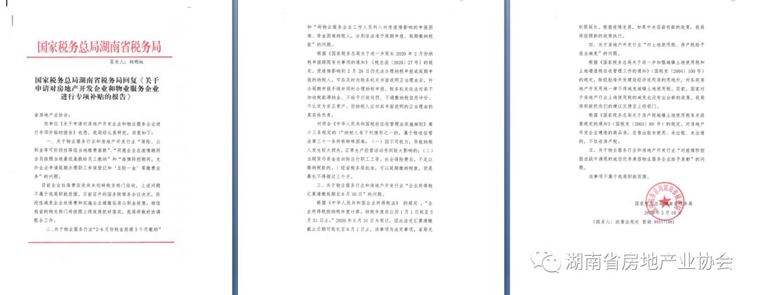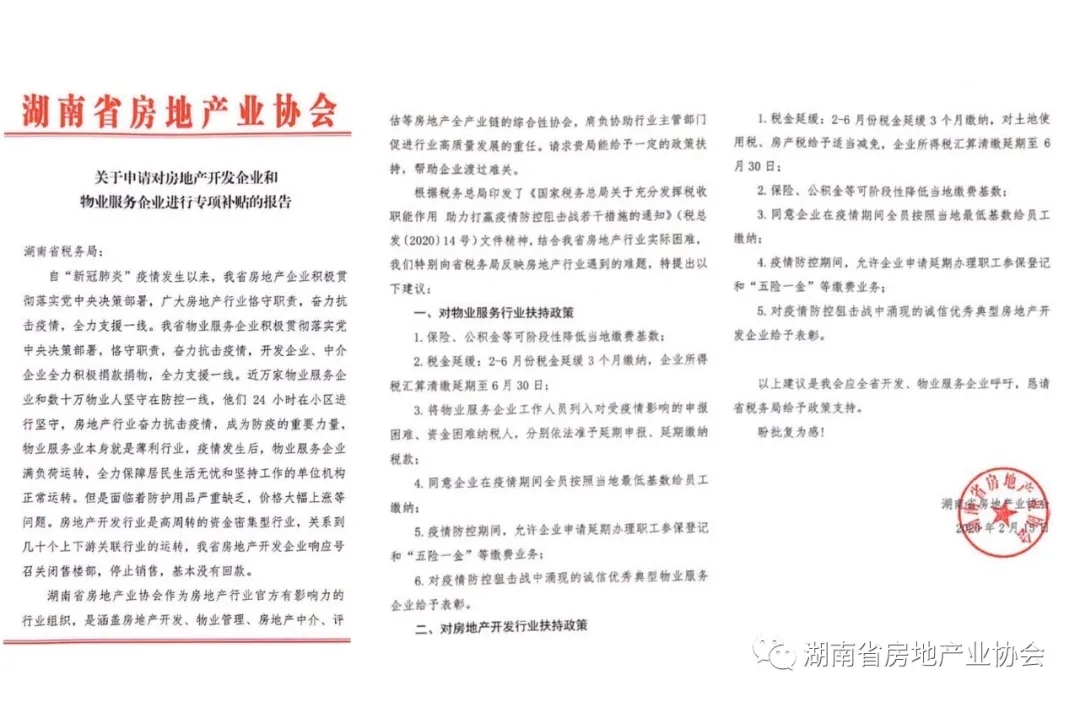 疫情過后行業如何迅速恢復生產,健康發展是省房協關切的重點。抗“疫”站打響以來,省房協一手推進抗疫防控,一手調研抗疫實情。據初步統計,疫情期間物業行業累計使用口罩近980萬個,84消毒液1151噸,酒精287.5噸,防疫物資和因“疫”而增加的人工成本高達1.5億元,為我省疫情防控工作做出了重要貢獻,卻也讓困難更為凸顯。針對因此而來的行業普遍困難,我會向湖南省財政廳、湖南省稅務局分別提交了《關于申請對房地產開發企業和物業服務企業進行專項補貼的報告》,為行業爭取扶持政策,渡過難關。報告得到了省住建廳領導的高度重視和幫助,順利提交。2月18日,國家稅務總局湖南省稅務局給予回復,表示會進一步重視并支持疫情期間物業服務行業和開發行業的減負工作,將部分我會提出的重點建議反饋至上級部門爭取政策支持。