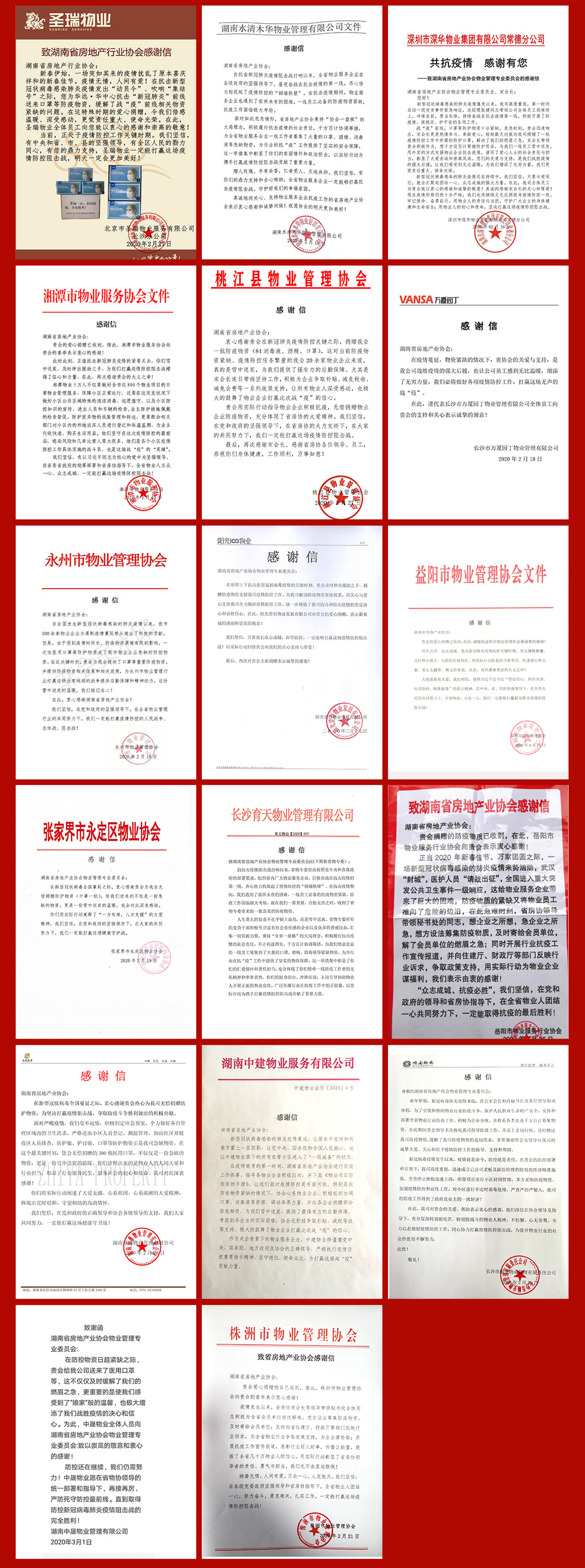 自疫情發生以來,湖南省房協向全社會發出倡議,積極募集防疫物資,向會員單位進行捐贈,同時組織對各市州物業管理協會、各物業企業會員單位和非會員單位進行定向捐贈。當協會致力于使我省房地產行業防疫工作得到更多關注和支持時,協會收到來自市州協會和會員單位的感謝信。