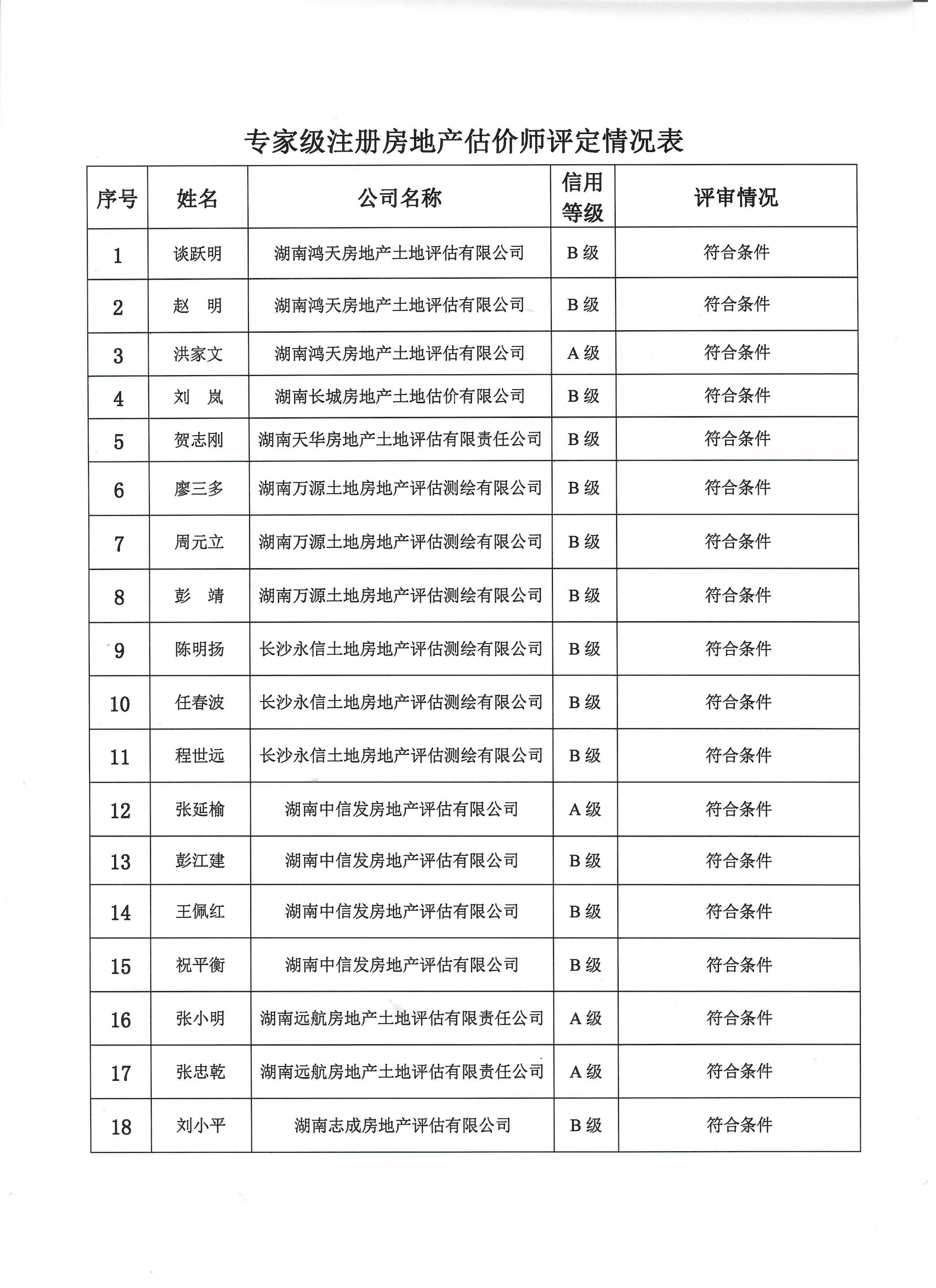 關于湖南省注冊房地產估價師執業等級評定情況的公示