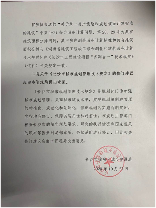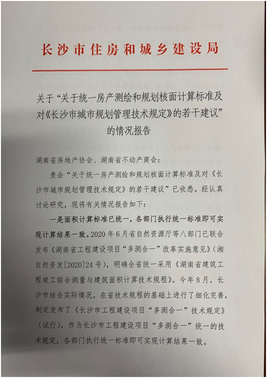 同時(shí),長(zhǎng)沙市住房和城鄉(xiāng)建設(shè)局給予了官方書(shū)面意見(jiàn)回復(fù)。對(duì)建議所提及的面積計(jì)算統(tǒng)一標(biāo)準(zhǔn),市建設(shè)局表示為深入貫徹落實(shí)黨中央、國(guó)務(wù)院和省委、省政府關(guān)于深化“放管服”改革和優(yōu)化營(yíng)商環(huán)境的部署要求,今年6月湖南省自然資源廳等8部委聯(lián)合發(fā)布了《關(guān)于湖南省工程建設(shè)項(xiàng)目“多測(cè)合一”改革的意見(jiàn)》,目前實(shí)施細(xì)則正在討論編制中,預(yù)計(jì)近期將推出,可完善解決協(xié)會(huì)提出的大部分問(wèn)題。