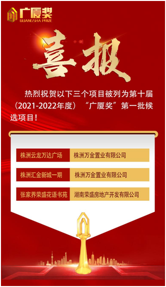 3月31日,由中國房地產業協會、住房和城鄉建設部住宅產業化促進中心共同組織的第十屆(2021-2022年度) “廣廈獎”第一批候選項目名單重磅出爐!經湖南省房地產業協會推薦的三個項目榮獲殊榮!