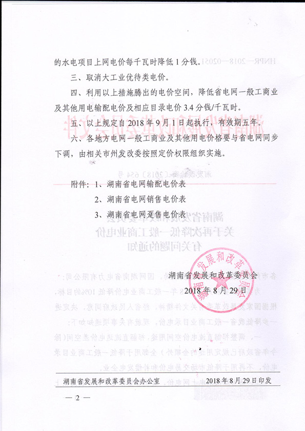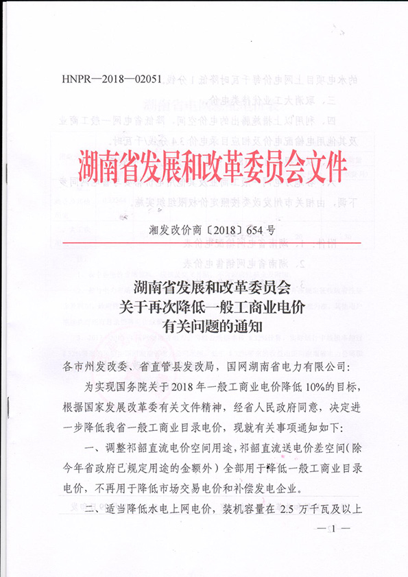 湖南省發展和改革委員會 關于再次降低一般工商業電價有關問題的通知