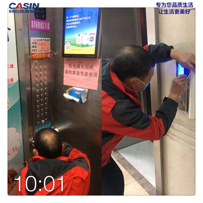 ___為確保業(yè)主出行健康安全,工程師傅張志雄被安排提前上崗,更換電梯按鍵薄膜以及紙巾;