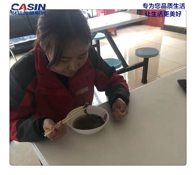 ___疫情期間,食堂實(shí)行分餐制,忙碌了一上午的客服小姐姐廖宇紅,比其他同事晚了30分鐘,才到食堂的吃著午餐。