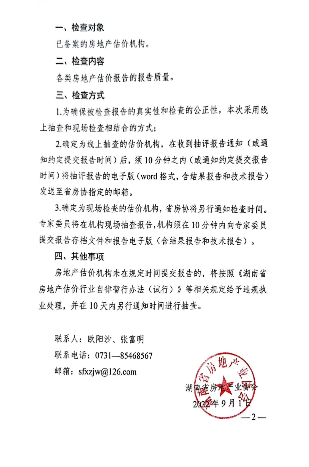 為進一步規范從業機構和人員執業行為,促進行業健康有序發展,根據《湖南省住房和城鄉建設廳本級2022年度“雙隨機、一公開”監管抽查工作計劃的通知》、《資產評估法》、《湖南省房地產估價報告評審辦法(試行)》、《湖南省房地產估價行業自律暫行辦法(試行)》等有關規定,定于2022年9月起開展全省房地產估價報告質量專項檢查。現就有關事項通知如下: