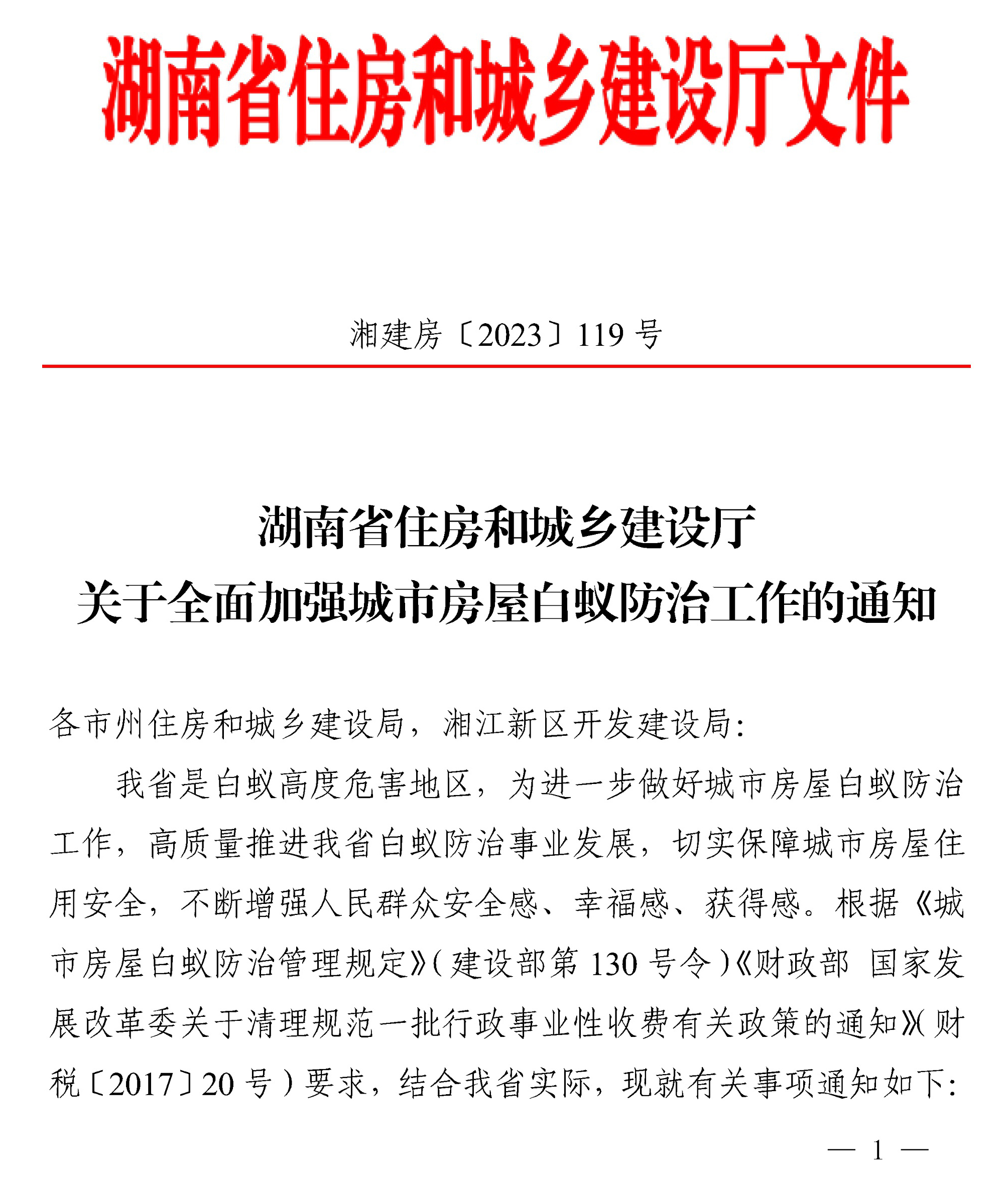 湖南省住房和城鄉(xiāng)建設(shè)廳關(guān)于全面加強(qiáng)城市房屋白蟻防治工作的通知