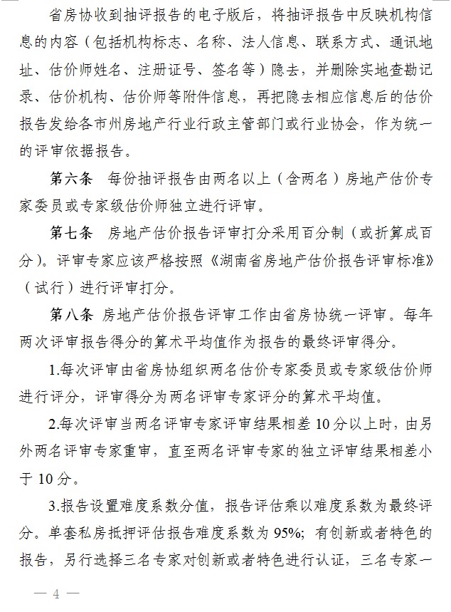 三、《辦法》第八條修改為:“房地產(chǎn)估價(jià)報(bào)告評審工作由省房協(xié)統(tǒng)一評審。每年兩次評審報(bào)告得分的算術(shù)平均值作為報(bào)告的最終評審得分。1.每次評審由省房協(xié)組織兩名估價(jià)專家委員或?qū)<壹壒纼r(jià)師進(jìn)行評分,評審得分為兩名評審專家評分的算術(shù)平均值。2.每次評審當(dāng)兩名評審專家評審結(jié)果相差10分以上時(shí),由另外兩名評審專家重審,直至兩名評審專家的獨(dú)立評審結(jié)果相差小于10分。3.報(bào)告設(shè)置難度系數(shù)分值,報(bào)告評估乘以難度系數(shù)為最終評分。單套私房抵押評估報(bào)告難度系數(shù)為95%;有創(chuàng)新或者特色的報(bào)告,另行選擇三名專家對創(chuàng)新或者特色進(jìn)行認(rèn)證,三名專家一致同意后確認(rèn)難度系數(shù),其難度系數(shù)分值區(qū)間為105%—110% 。”